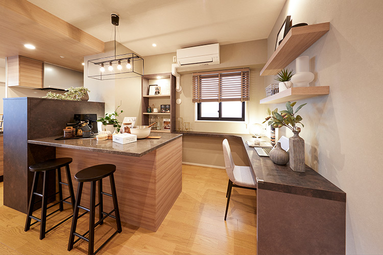 「LDKにプラスアルファの要素を加え、家族をより身近に感じられる空間に。ただ書斎スペースにするのではなく、お料理はもちろん、お子さんが宿題をしたり、軽く仕事をしたり、多目的に使えるよう設計。インテリアも“カフェで仕事をしているような雰囲気”をめざし、ナチュラルな中間色を取り入れています。ベースカラーのグレーともうまく馴染み、ファミリーエリア全体としての統一感も保っています」