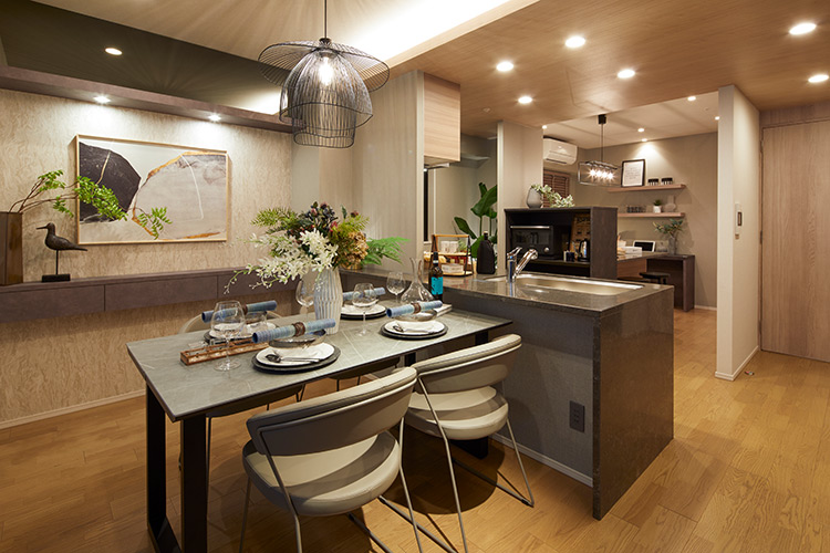 「ダイニングは、キッチンやキッチンスタジオ、リビングとのつながりを意識しながら、上質さを意識しました。リビングやキッチンスタジオが比較的カジュアル寄りなので、空間をまたぐことで雰囲気の変化を楽しめるようにしています。また、奥の壁には間接照明とアートを設えてフォーカルポイントに。ダイニングはグレーで統一し、テーブル天板は石目調を用いて上質感を出しながら重々しくならないように配慮。ペンダントライトも黒のアイアンで直線的なデザインを選び、落ち着いた印象を与えています」