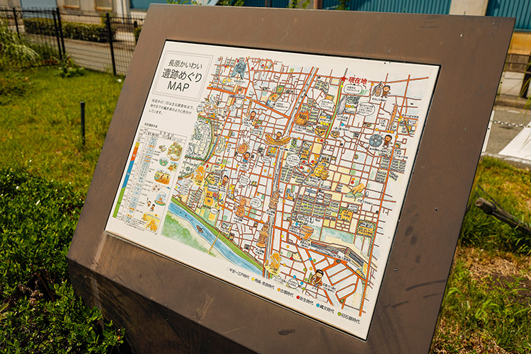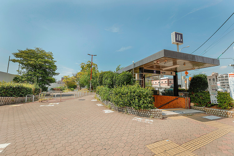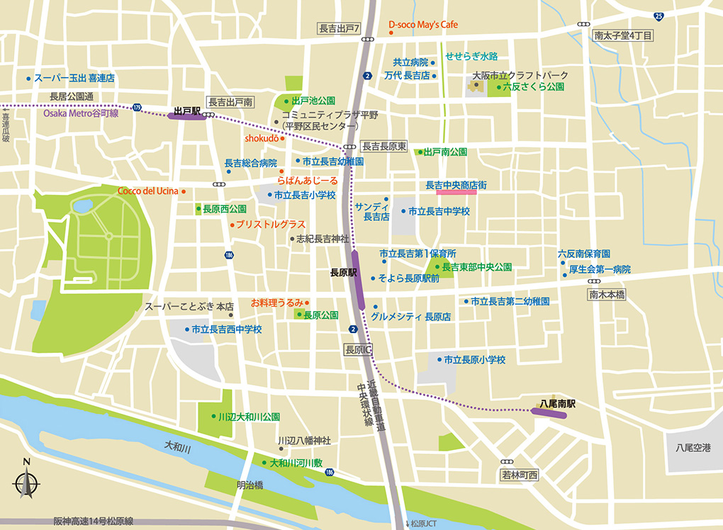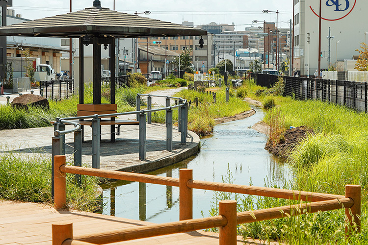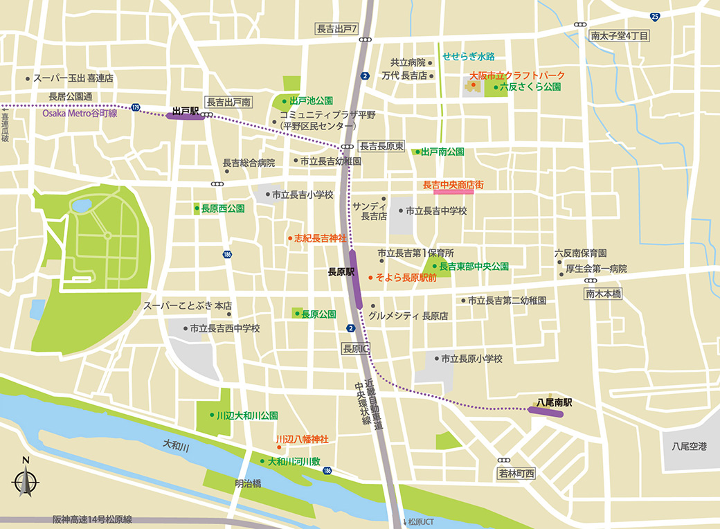 「長原」駅と「出戸」駅の周辺は、第一種住居地域を中心とした住居エリアが広がり、大小さまざまな公園が点在。大阪市内とは思えない落ち着いた雰囲気が漂います。大阪市立クラフトパーク付近には、のんびり散歩ができる「せせらぎ水路」があり、その傍らには遺跡めぐりマップが。辺りは「長原遺跡」と呼ばれ、古墳や古代の建物跡などが発見されており、古くから人々の営みがあった地域と考えられます。