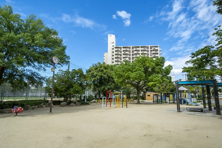 「ローレルスクエア長原ザ・ランドマークス」の東側に位置する公園。小さな子どもたちが遊べる遊具から広大なグラウンドも備えています。