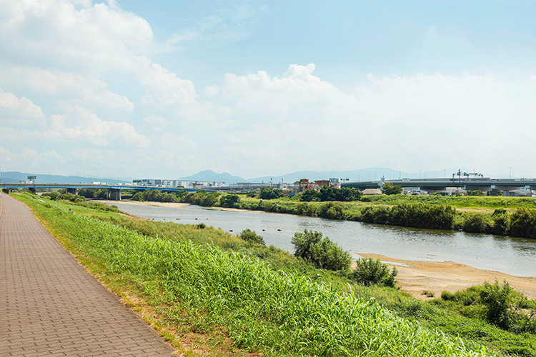 開放感あふれる大和川の河川敷。明治橋より東側は歩道が整備され、ウォーキングやランニングが楽しめます。