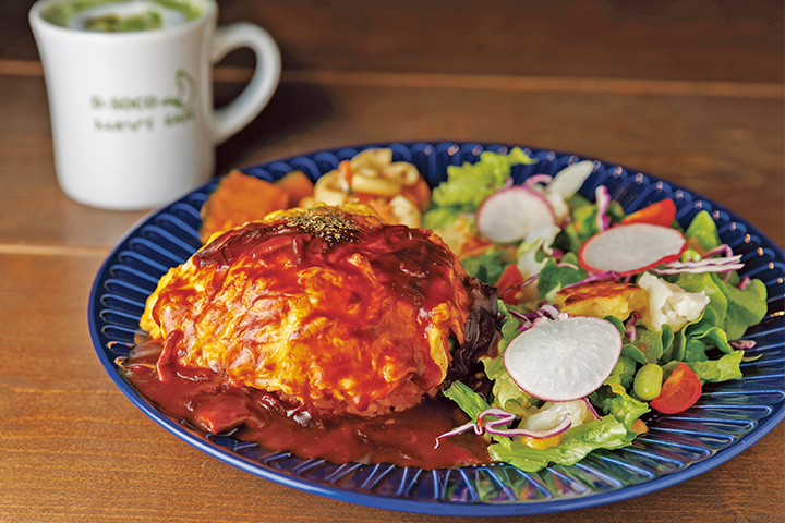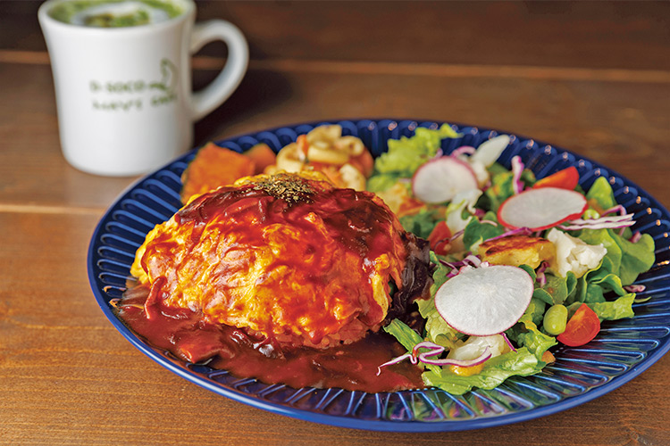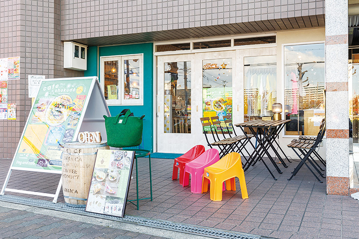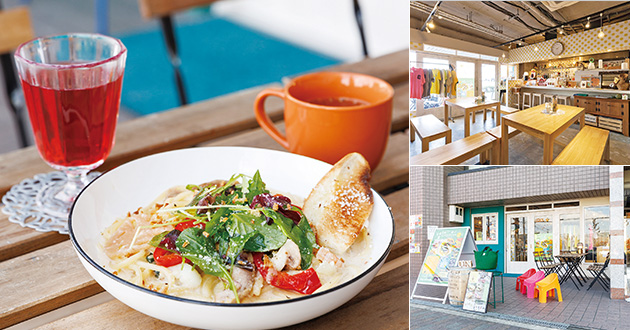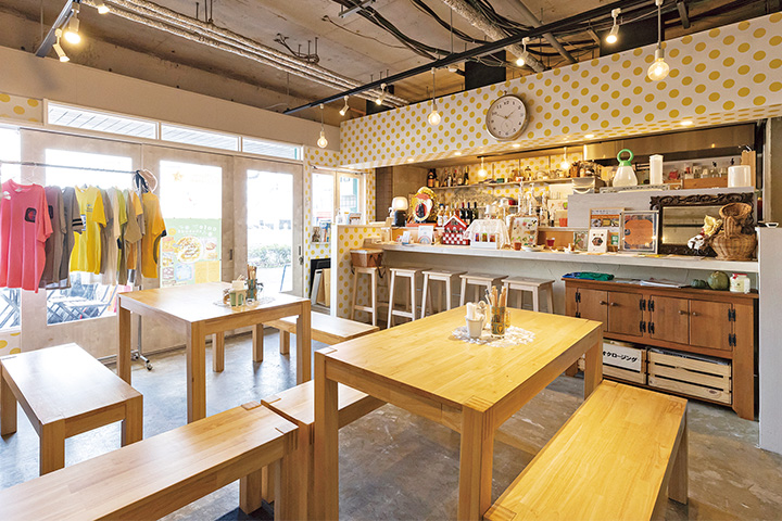 コバルトグリーンの外壁が印象的なコミュニティカフェ。イエローベースのマッサマンカレーやたっぷり野菜を用いたパスタなど、国産の食材や季節野菜を使ったランチメニューが味わえるほか、卵黄のみを使った濃厚でなめらかな特製プリンが人気です。北欧系のウッディなインテリアにレモンイエローのドット柄が映える店内にはキッズスペースがあり、お子さま連れでもゆったりくつろげるのがうれしいポイント。テラス席はワンちゃんOKです。また、無農薬野菜のマルシェや環境にやさしいエシカルラップのワークショップなど、さまざまなイベントも開催されています。