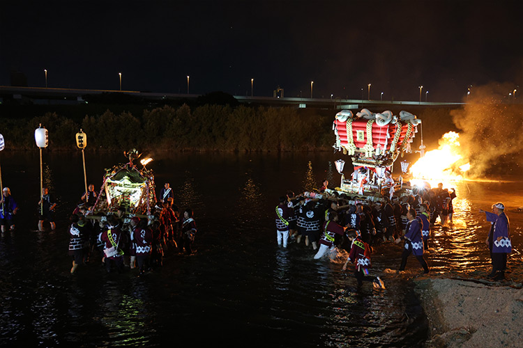 川辺八幡神社で毎年9月の秋祭に、大和川へ布団太鼓とお神輿を担ぎ入れる足洗い神事が行われます。大和川付け替えの際に現在地に遷された八幡さまに故郷にお帰りいただく神事といわれ、地域住民によって大切に受け継がれています。