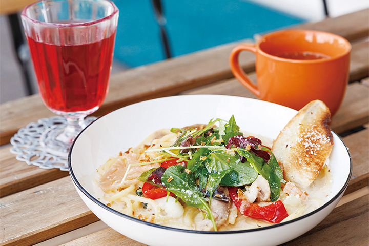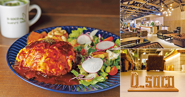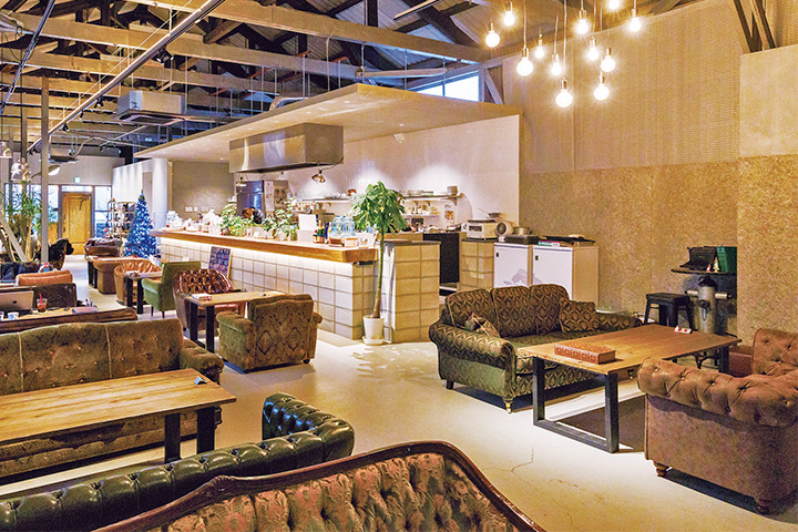 約60坪もの倉庫をリノベーションした人気のカフェです。デザインの異なるさまざまなソファを配した広い店内は開放感いっぱいで、つい長居してしまう居心地の良さが魅力。ソファ席でくつろぎながら、スペシャリティーコーヒーやお酒を楽しむことができます。身体にやさしい素材にこだわったフードメニューが豊富にそろい、手作りハンバーグやふわトロオムライス、May‘sガパオライスをはじめ、パスタやピザ、各種アラカルトも。また人気のワッフルやフレンチトーストといったスイーツも充実。ペット同伴で利用できます。