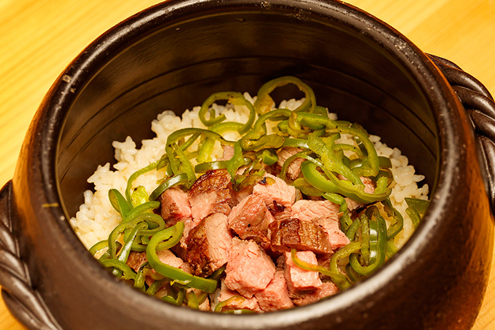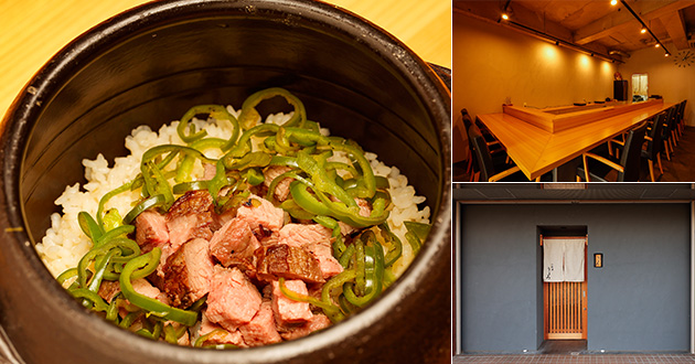 旬の食材を使った本格的な料理をリーズナブルに愉しむことができる和食コース専門店です。高級店を思わせるシンプルで落ち着いた雰囲気の中で提供されるコースは全12品。メニューは月ごとに替わり、季節の魚介を中心に、先付けから2種のお造り、焼き物、小鍋など多彩な料理を少量ずつ味わえます。また、日本酒のラインナップは常時10種類ほど。昆布や鰹といった基本となる出汁にこだわり、素材を引き立たせたお料理とお酒のマリアージュを堪能することもできます。写真は黒毛和牛のローストビーフを使った釜飯。脂身の少ないモモ肉を使い、締めにふさわしい満足感あふれる一品です。