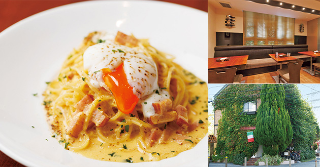 蔦の絡まるレンガ造りの外観がひときわ目を惹く一軒家イタリアン。アットホームな雰囲気の中で旬の素材を使った料理が堪能できます。数あるメニューの中で特におすすめなのが、名物のカルボナーラです。養鶏所であるオーナーの奥さまの実家から毎日届く新鮮な大阪地たまごを使い、まろやかなその味わいは男性やお子さまにも好評。また、アラカルトが充実し、ワインとのマリアージュをリーズナブルに愉しめます。前菜・サラダ・ハーフパスタ・パン・ハーフメイン料理・プチデザートが食べられるお得なレディースランチセットも。ディナーは要予約です。