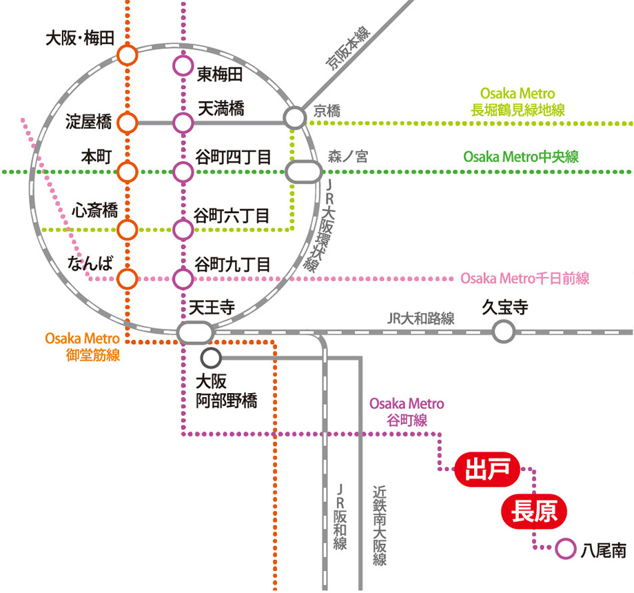 「長原」駅と「出戸」駅はどちらもOsaka Metro谷町線。梅田や天王寺など、大阪市内主要部へ乗り換えなしでアクセスできるほか、Osaka Metroのすべての地下鉄路線と接続し、大阪市内各所への移動も便利です。また、平日は朝・夕方の各4本が「長原」駅始発(「都島」駅行き)のため、通勤・通学も快適です。