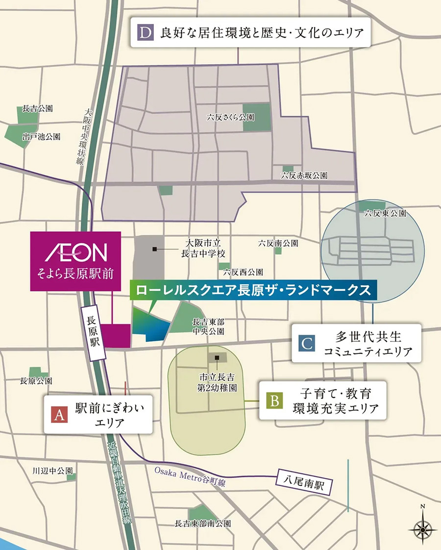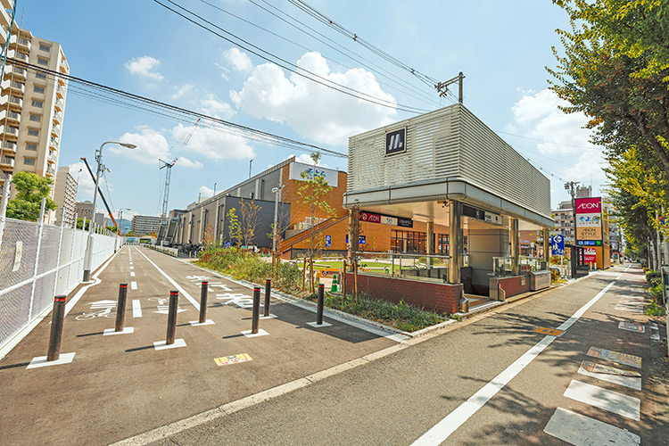 「長原」駅周辺は、「長吉ウェルカムタウン計画」のもとで再開発が進められています。「次世代につなぐ魅力あるまちづくり」を掲げ、主な未利用地を4つのエリアに分けて開発が進行中。そのうち、駅前にぎわいエリアではイオンと、大規模レジデンス「ローレルスクエア長原ザ・ランドマークス」の一体開発が進められ、駅と住まいを結ぶ自転車・歩行者専用道路も整備されています。