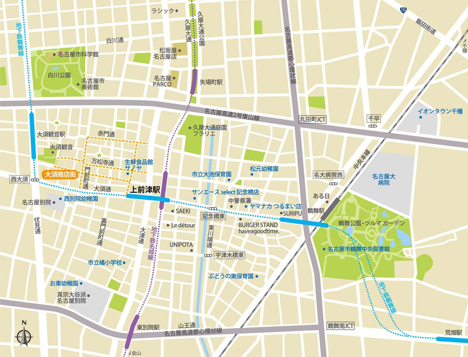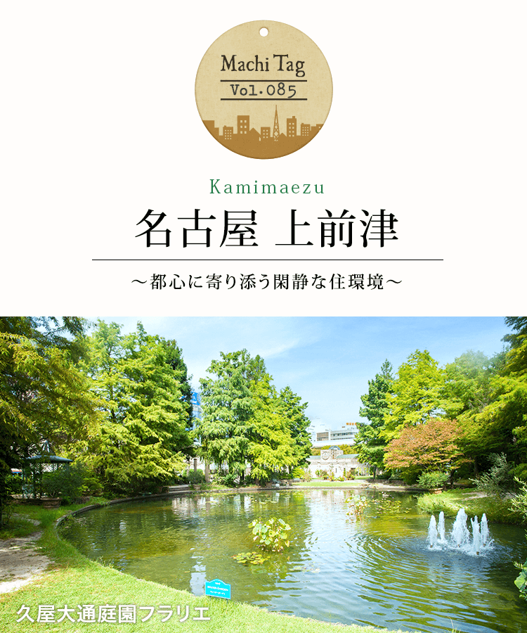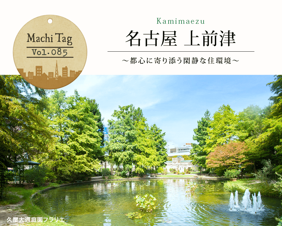 「上前津」駅周辺は、大須エリアの南東に位置し、北側に大型商業施設やブランドショップが軒を連ねる栄エリアに寄り添う立地。都心の賑わいや華やぎを日常的に堪能できるほか、久屋大通庭園フラリエや鶴舞公園が近隣にあり、ゆったり憩う時間も身近に愉しむことができます。