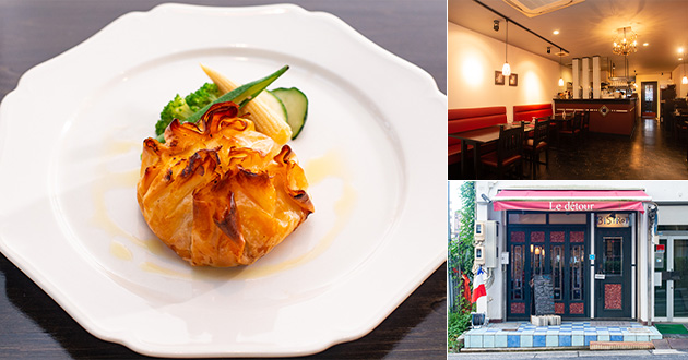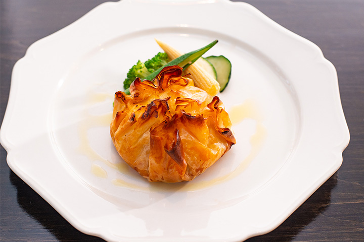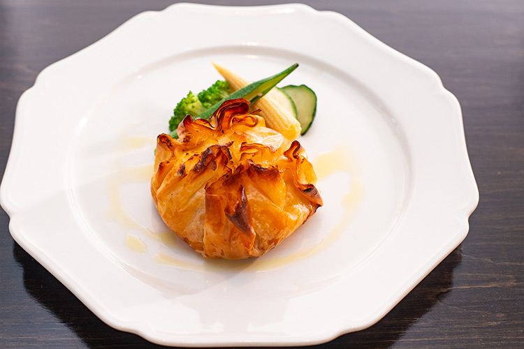 フランスの家庭料理や、伝統的なフレンチのアレンジメニューを中心に提供。人気メニューの一つが、ランチタイムにいただける「牛肉の煮込みとジャガイモのピューレのパートフィロ包み焼き」。さくっとしたパイの内側にあるのは、トマトと共に煮込んだやわらかい牛肉と、とろける食感のジャガイモピューレ。肉料理ながらくどさがなく、どこか懐かしい味わいが楽しめます。ランチタイムはカジュアルな雰囲気がありますが、ディナータイムはメニューの内容が格上げされ、店内の雰囲気もややフォーマルに。記念日をはじめ、特別なシーンにもぴったりと寄り添ってくれます。作家もののステンドグラスで彩られた、落ち着きと美しさがある空間も魅力。