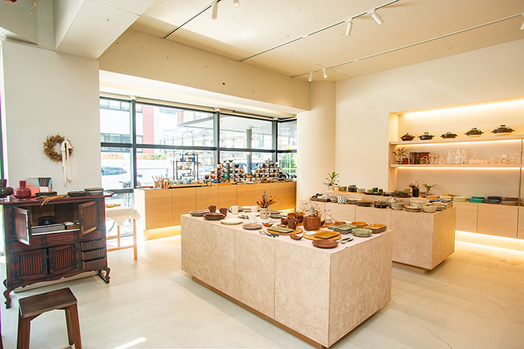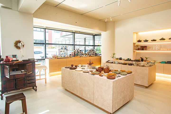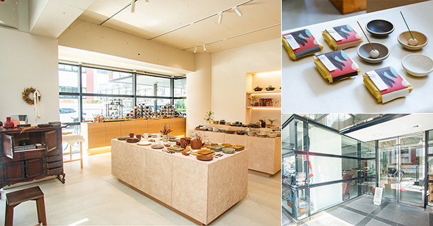 2024年7月にオープンした、器のセレクトショップ。店内に陳列されているのは、美濃焼や波佐見焼、益子焼など、さまざまな焼き物。店舗のスタッフが手作りしたお香玉をはじめ、500円以内で購入できる品もあるため、気軽に足を運べます。また、店内の一角には現代にはない風合いをもつ古物の器も。金継ぎが施された“1点もの”の器が並ぶこともあり、宝探しをする感覚で器選びが楽しめます。建築デザイナーが手がけた、まるで美術館のような内装も見どころの一つ。美濃焼のタイルを用いるなど、こだわりが光る空間です。今後は、店内のイベントスペースでワークショップも開催されます。