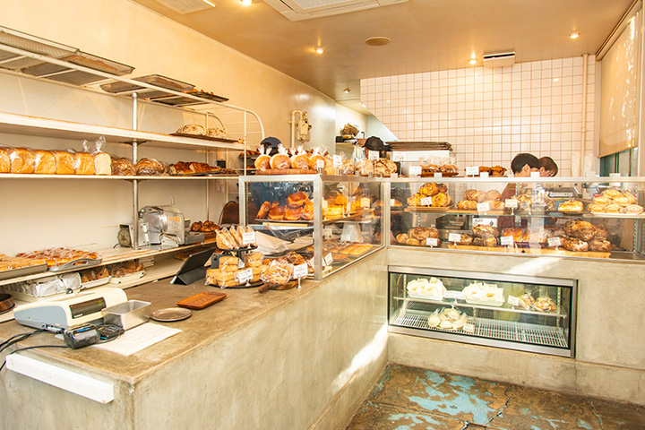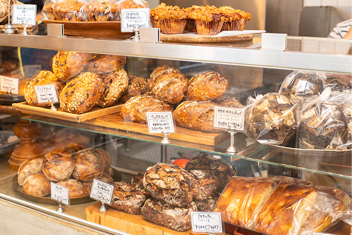 開店前から行列ができる、人気のベーカリー。開店直後は約30種類の商品がショーケースに並び、その後、ラインナップが徐々に入れ替わります。午前中に陳列される商品の半分ほどは、どっしりとしたハード系のパン。これらは、小麦やフルーツが由来の天然酵母を使って焼き上げたパンで、ほんのりとした酸味や、素材のもつ旨味が感じられるのが魅力です。また、風味が豊かでもっちりとした食パン、バターの香りとサクサク感がたまらないクロワッサンも、ぜひ味わいたい一品。具材の組み合わせに創意が感じられる、唯一無二の味わいのサンドウィッチも外せません。時間帯を変えて訪れると新鮮な出合いが楽しめるため、何度でも足を運びたくなるはず。