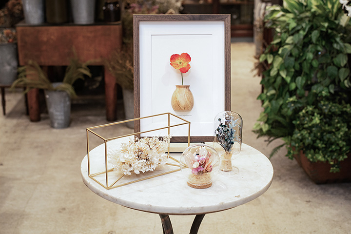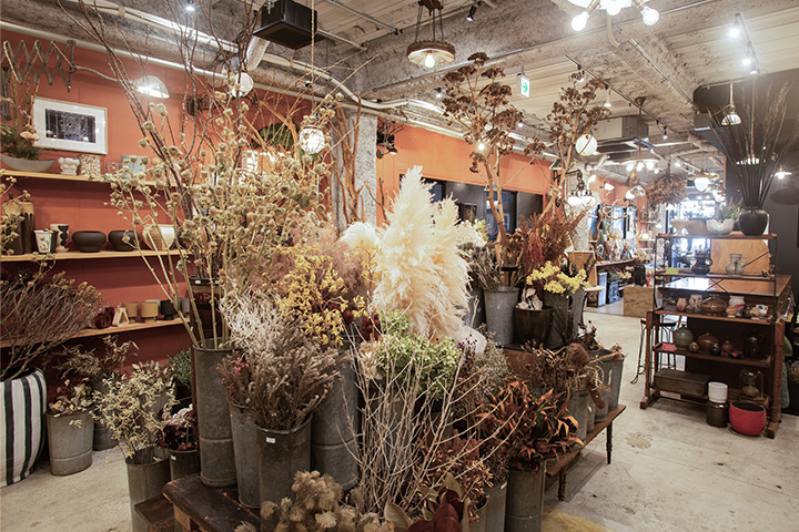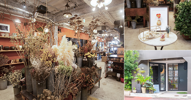「もともと植物とアンティークが好きで。『表現の場がほしい』という想いもあり、2016年に当店を開きました」とは、店主の大澤さん。店内にある主なアイテムは、季節の花のドライフラワーと様々な花瓶。ドライフラワーは独自の手法で仕上げたもので、生花の雰囲気が多分に残されています。約3ヶ月間は色が大きく退色せず、室内を美しく彩ってくれるそう。店内の一角には、オリジナルで創作したインテリアも。ドライフラワーを使った可愛らしいインテリアで、プレゼントにも最適です。また、オーナーである大澤さんはいろいろな他業種でも活動しており、豊富な経験をもとに「新居をドライフラワーなどで飾りたい」といった希望にも対応可能です。