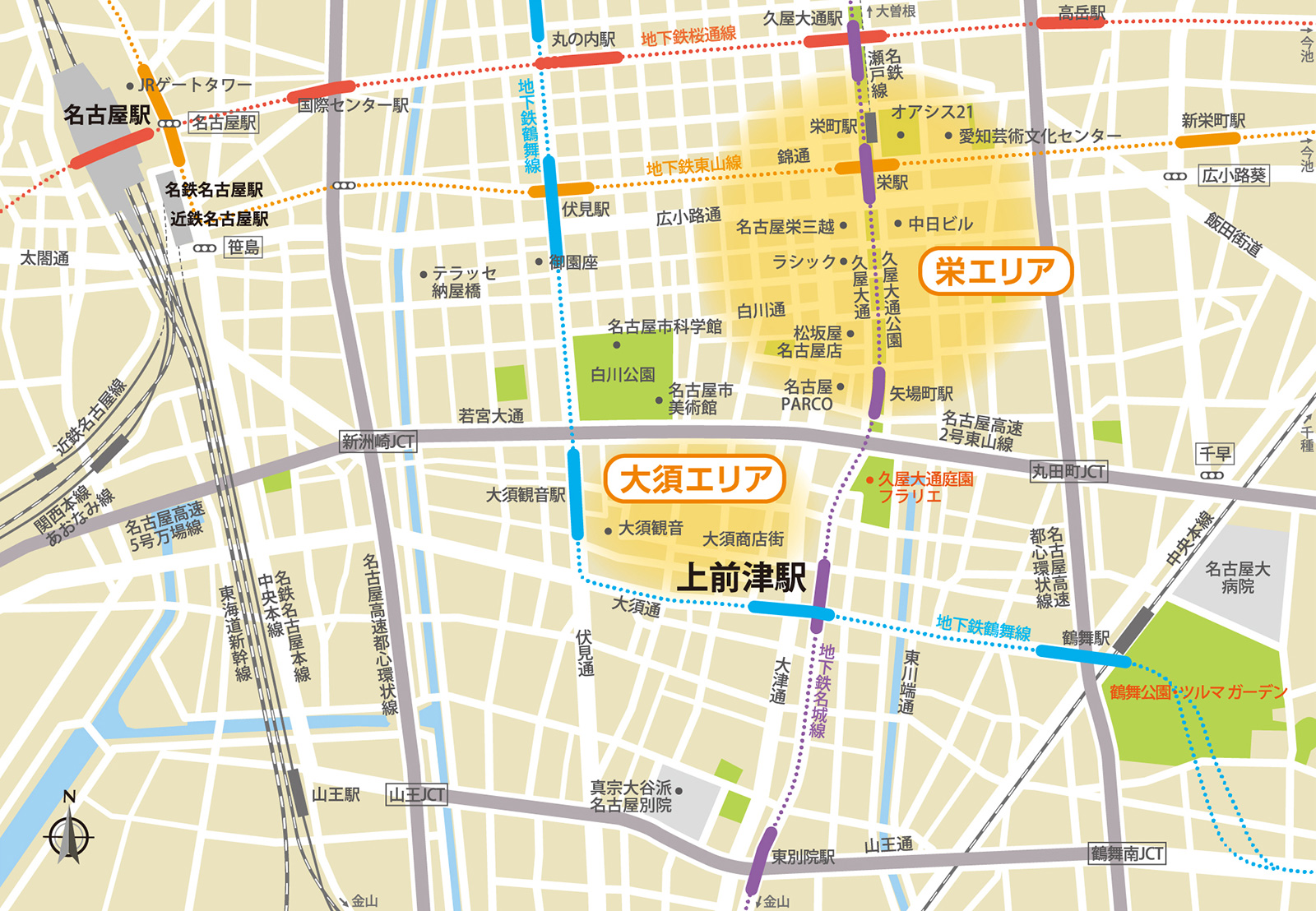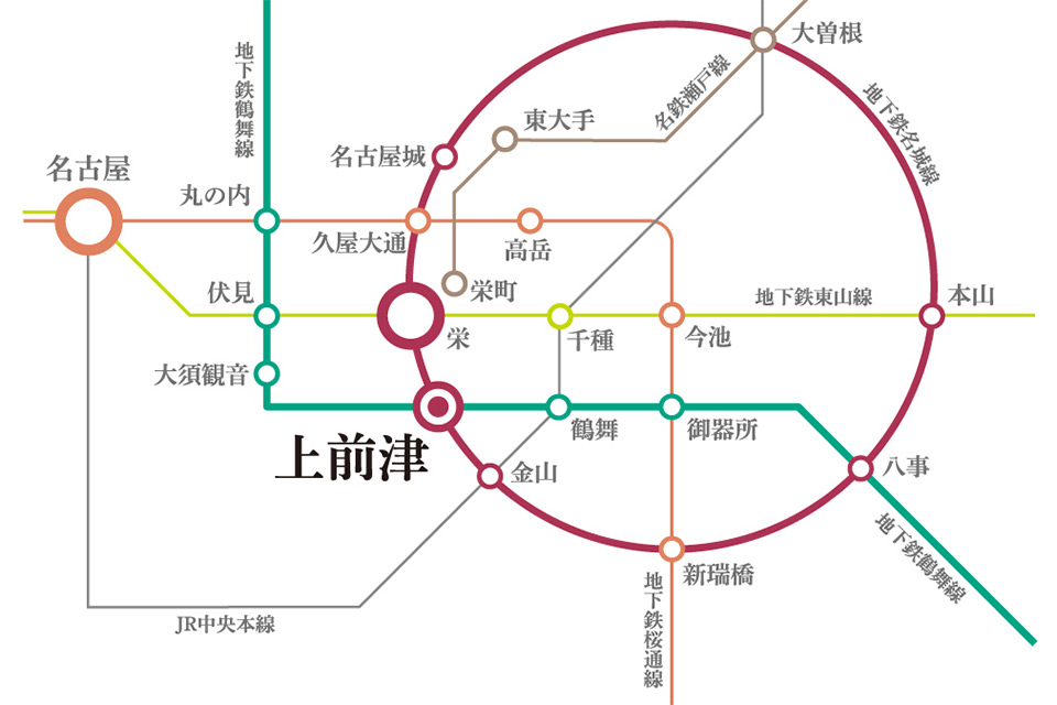 「上前津」駅は、地下鉄名城線・鶴舞線の2路線が利用でき、少し歩けばJR中央本線「鶴舞」駅も利用可能。名城線で「栄」駅へ、鶴舞線で「伏見」駅へそれぞれ直通3分、「名古屋」駅にも東山線乗換で10分と名古屋市内の主要部へスムーズにアクセスできます。