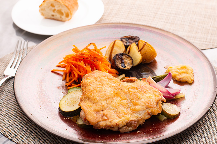 “正直”と“丁寧”を信条に、手間ひまをかけた逸品を提供するカジュアルフレンチ。当店の看板メニューは、ローストチキンです。チキンに何度も油をかけながら火を通すことで、ふっくらとしてジューシーなローストチキンに仕上がるそう。なお、ローストチキンと付け合わせのワンプレートもあり、こちらをオーダーすると、1人分に切り分けたチキンを味わうことができます。また、鶏モモ肉のソテーも外せない一品。表面はパリッとしつつも身がやわらかく、大きめなソテーながらあっという間に完食してしまいます。パンを3日間、卵液に漬け込んで仕上げるフレンチトーストや、リンゴの旬の時期だけ提供しているアップルパイも人気。桜並木沿いという立地も魅力です。