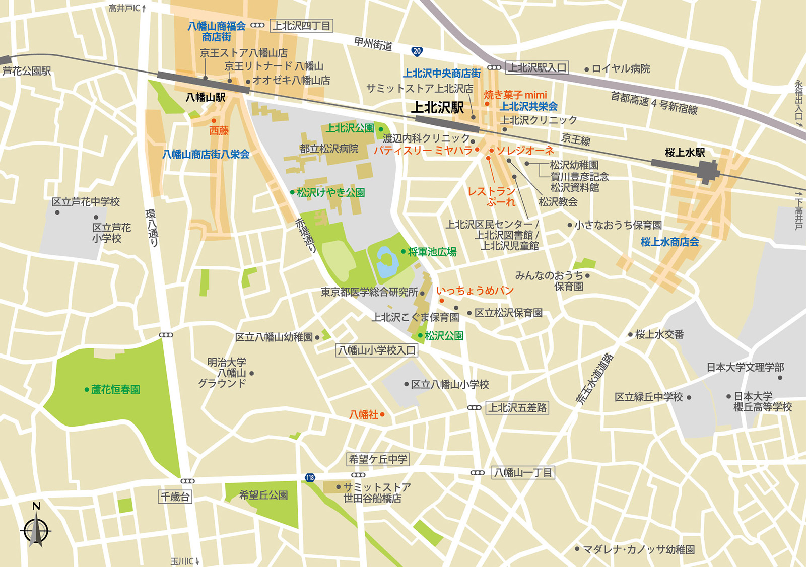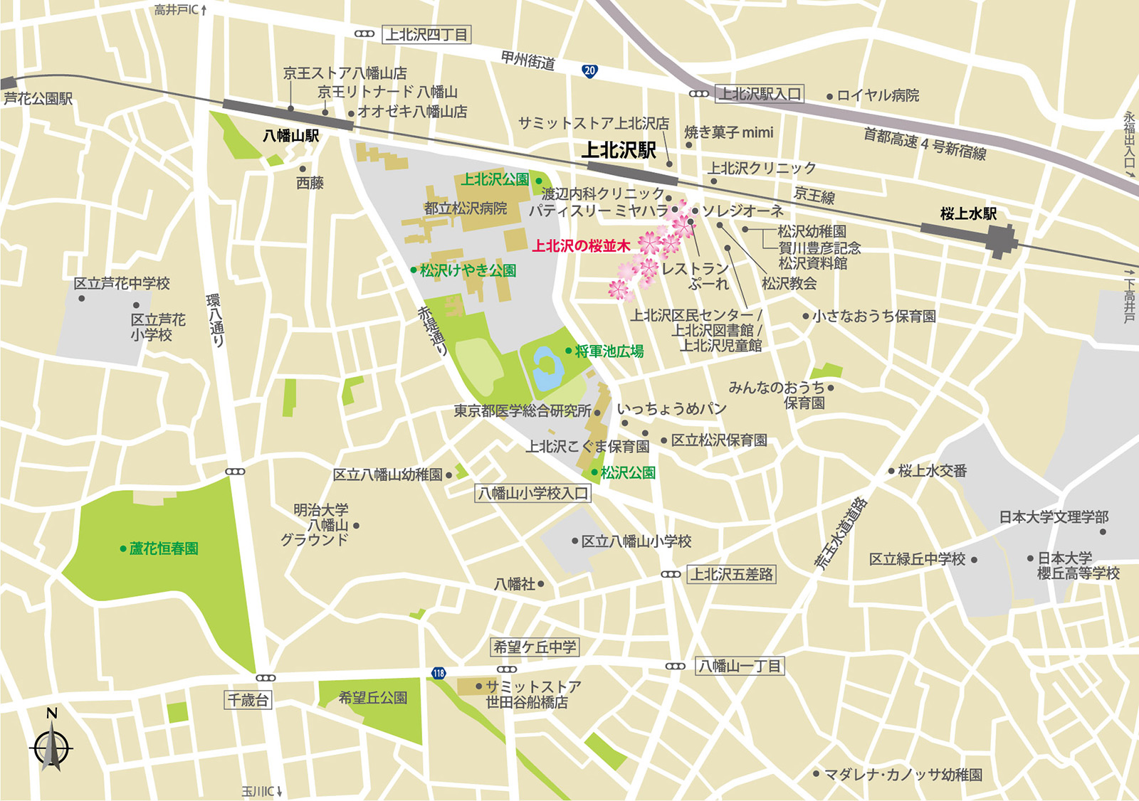 「上北沢」駅を中心にして閑静な住宅街が広がり、「上北沢の桜並木」をはじめとする緑豊かな街並みが印象的。公園の数が多いことで知られる世田谷区の中で、上北沢エリアも例外ではなく、大小さまざまな公園が点在。落ち着きと潤いのある住環境が整っています。