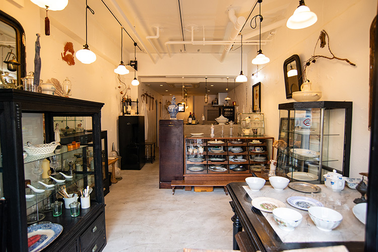 八幡山駅のすぐ近くにある、アンティークショップ。白とグレーを基調としたシンプルな空間に並ぶのは、アンティークの食器やカトラリー、オブジェなど。1〜2ヶ月に一度のペースで、ギャラリーとして個性的な作家による作品展も開催されます。また、店舗奥のカウンターでは、ワインやガレットなどが味わえます。「ワインを片手に、気軽にアンティークや作品の鑑賞を楽しんでいただきたいです」と語る店主さん。貴重な品々に囲まれながら、お酒と会話を愉しむ。そんな贅沢で心満たされる時間を求め、足を運んでは。