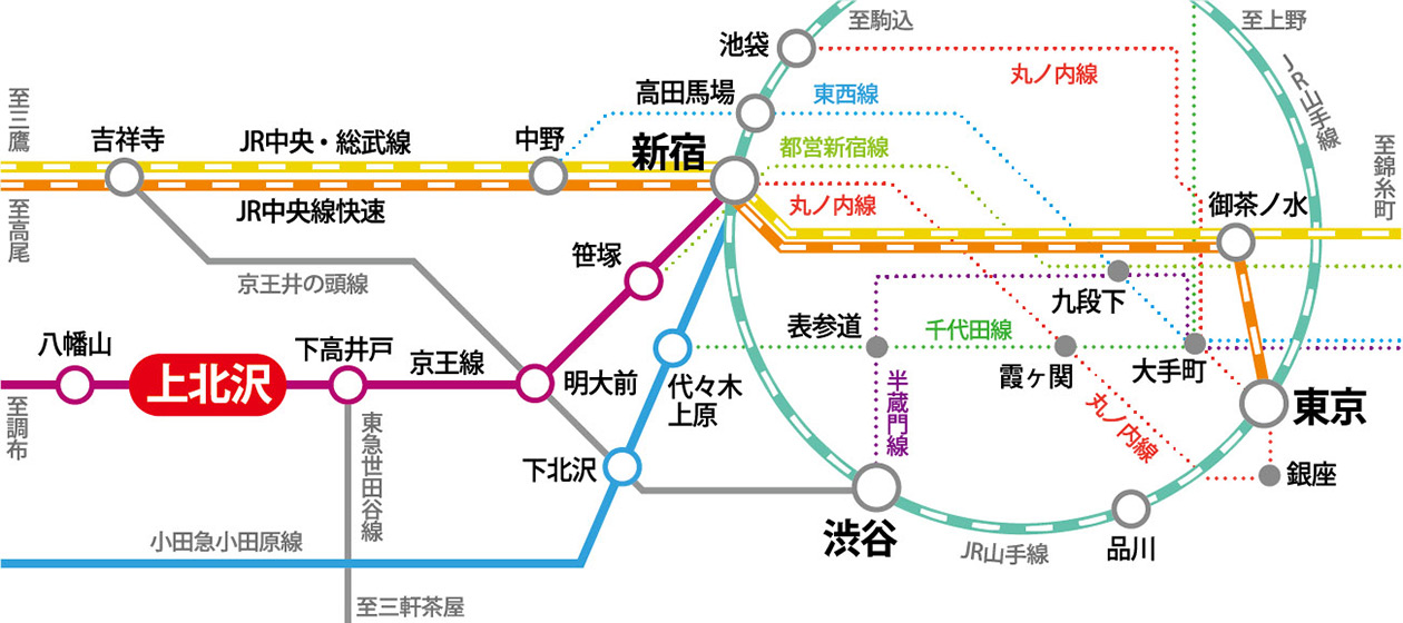 京王電鉄京王線「上北沢」駅は、新宿まで乗り換えなしで約15分。「明大前」駅で京王井の頭線に乗り換えれば、渋谷方面へのアクセスも便利です。また、京王線は都営新宿線と相互直通運転を行っており、都内各所への移動もスムーズ。都営新宿線は東京メトロ銀座線を除く、全ての地下鉄路線と乗り換え可能です。