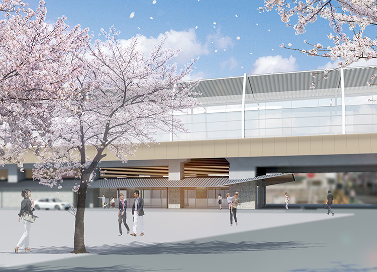 京王電鉄京王線(笹塚駅〜仙川駅間)連続立体交差事業により、「上北沢」駅の高架化が進められています。外観は、落ち着いた色合いと透明感のある素材を組み合わせ、地元のシンボルである桜並木が映えるデザインを計画。踏切の解消により、「上北沢」駅周辺の利便性や快適性の向上が期待されています。