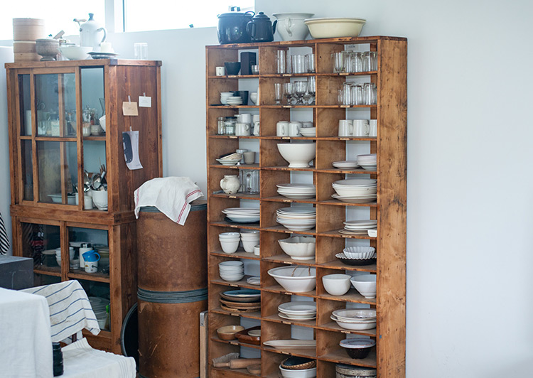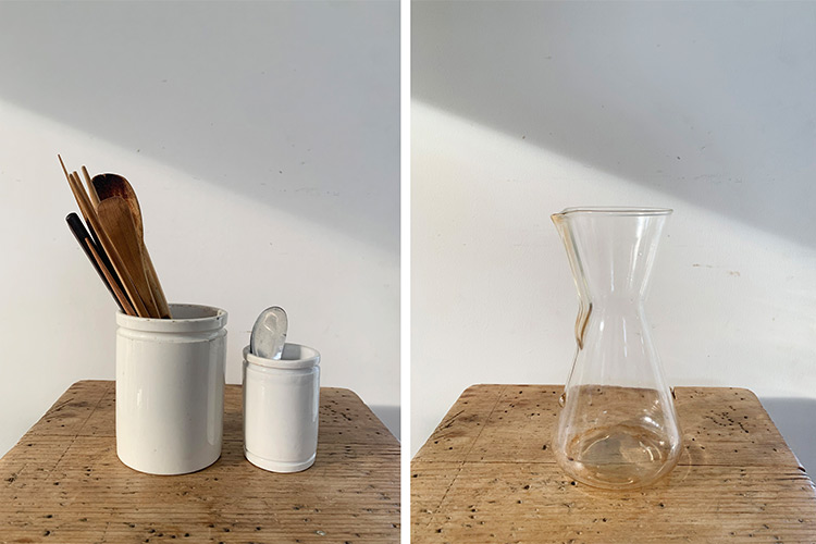 イギリスジャーは、1870年〜1920年代のイギリスの陶器。アンティーク品ならではの、どこか懐かしさもある雰囲気です。もともとジャムの保存容器だったのをカトラリー入れとして使用。様々な種類があり、コレクション心をくすぐるアイテムです。ケメックスのコーヒーメーカーは、15年くらい前に一目惚れして購入したヴィンテージ品。毎朝コーヒーをドリップするときに使っています。実験器具のようなフォルムゆえ、ドリップはまさに美味しく淹れられるか実験しているかのようで、ワクワクさせてくれます。握りやすく使いやすいフォルムも秀逸です。