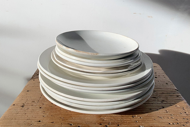 白で統一したアンティークのお皿。サイズ、形、厚み、エッジの立ちあがりなどデザインも様々。用途によって使い分け。お気に入りのアンティーク屋さんでウンチクを伺いながら、吟味してコツコツ収集してきました。フランスへ直接出向いて探しまわり、我が子のように抱きかかえて持ち帰ったお皿も多数。どんな料理も美味しくみせる魔法のような一品です。20年以上愛用していますが、まったく飽きません。