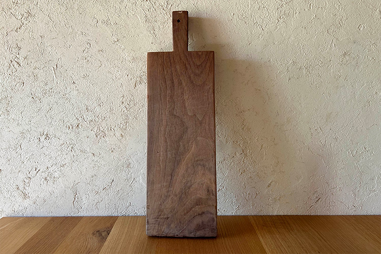 広島で古道具や雑貨などを扱う「bol.」のオリジナルカッティングボード。かなり厚くてガッチリとした安定感があり、木も硬いので遠慮なく使え、日常使いにぴったりです。オイル塗装で色が濃く、少しのシミなども気にせず使えるのがうれしいポイント。パンや焼き菓子、フルーツなど、そのまま乗せて食卓へも出せる優れものです。