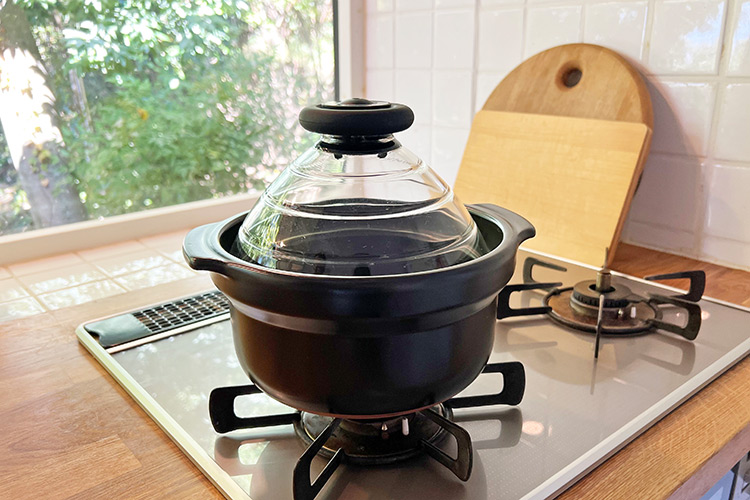 タジン鍋のような、ちょっと変わった形のご飯釜。火をかけてしばらくしたら、ホイッスルが鳴り、火を止めるタイミングをお知らせしてくれます。このホイッスルのおかげで、コンロの前で見張りをしなくてよく、上手に炊けるので助かっています。フタがガラスでできているので、中でお米が炊けていく様子が見えるのもいいところ。気軽で、なによりも美味しく炊けるところが気に入っています。