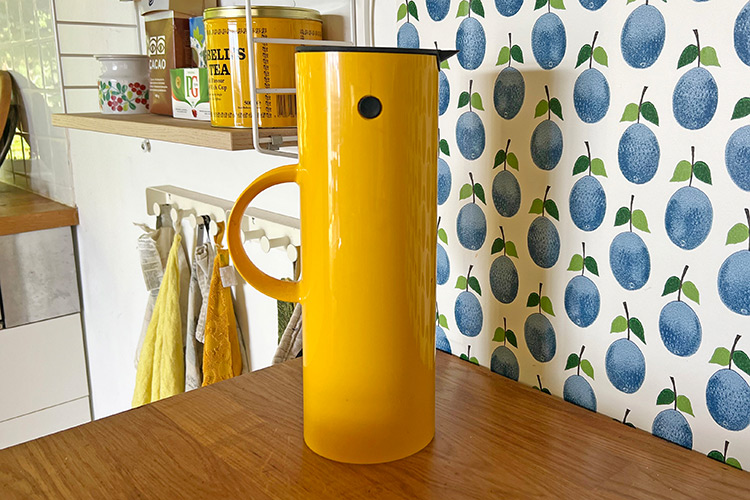 北欧の家庭やオフィスで使われているのをたびたび見かけていたバキュームジャグ。デンマークでは一家に一台必ずあるという話も聞いたことがあります。魔法瓶のように保温性があり、あちらではコーヒーを入れてよく使っているようです。デザインも素敵でいいなぁと思っていたら、松本の古道具市で見つけて、我が家にも迎えることにしました。寒い時期はたっぷりお茶を沸かして、このポットに入れて使っています。飲みたい時にささっと熱々が飲めるので、重宝しています。