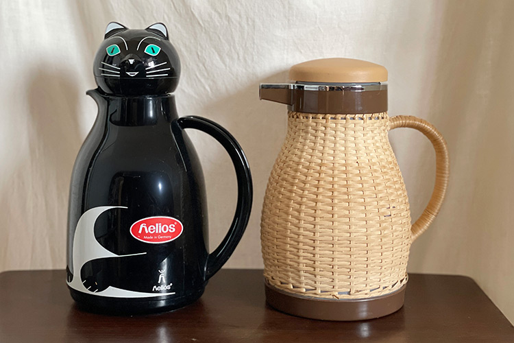 猫が好きなので、自然と猫の雑貨も集めているのですが、ドイツ製・ヘリオスの魔法瓶ポットは一目惚れ。白と黒、2色ある中、黒を選びました。なんともいえない表情の猫に親しみを覚えます。45°C〜60°C以上で、10〜24時間保温ができます。籐の魔法瓶は昔実家にあったものと同じものをリサイクルショップで見つけて「懐かしい!」と購入。私はお茶が好きで一日中お茶を飲むので、朝お茶を淹れて、どちらかのポットで保温しながら味わっています。ピクニック(お花見)などにも持っていけるので便利です。