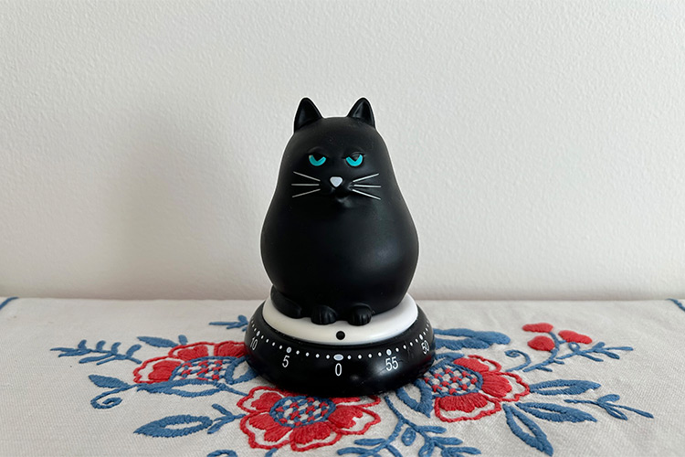何か言いたげな、愛嬌のある表情がたまらなく可愛い黒猫のタイマー。たまに鳴らないこともあるけど、「まぁ、そういう日もあるよね」と思わせてくれる不思議な魅力があります。デジタル全盛期の時代に、あえてカチカチと手で回すアナログ感が愛おしくて、気づけば台所の片隅で見守ってくれている“台所の守り神”のような存在になっています。